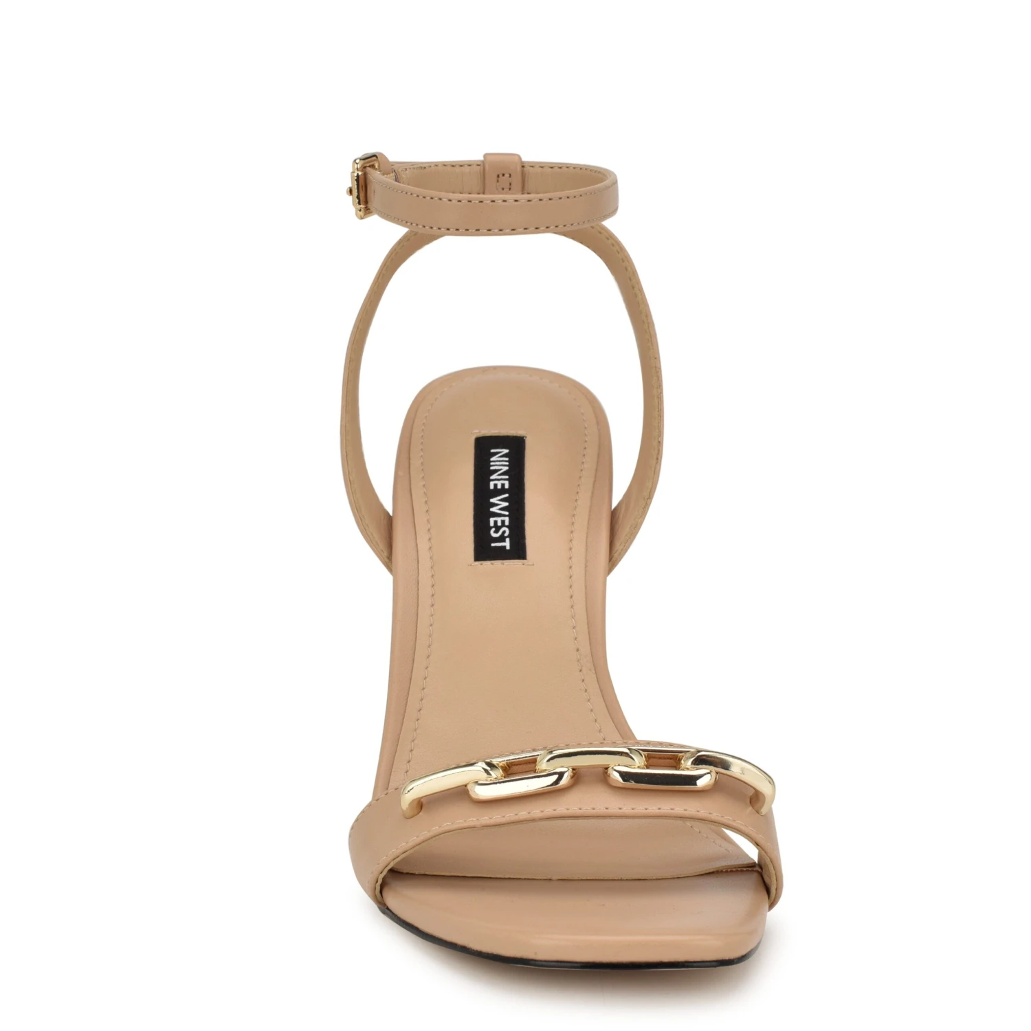 Elevate your wardrobe in the Nine West Neela dress sandals. It features a modern square toe, an adjustable ankle strap and gold chain detailing on the upper. Plus, it offers a tapered heel.